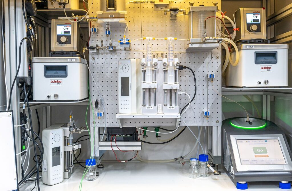Forschende haben nun einen innovativen Syntheseprozess zur Herstellung von Feinchemikalien entwickelt. Während herkömmliche Verfahren mit einer Abfolge diverser Reaktoren und Rührkesseln arbeiten, bei der nach jeder Reaktion die entstandene Produktlösung für den nächsten Schritt vorbereitet und in einen anderen Behälter überführt werden muss, entsteht das Endprodukt bei dem neuen Verfahren in einer kontinuierlich ablaufenden Synthesekaskade, im besten Fall innerhalb eines Reaktors. Das Verfahren führt zu einer wesentlich effizienteren Prozessführung und einer nachhaltigeren Produktion durch verkürzte Umrüstzeiten und einen geringeren Energiebedarf. Diese Vorteile haben direkten Einfluss auf die CO2-Emissionen des Syntheseprozesses und dessen Kosten.