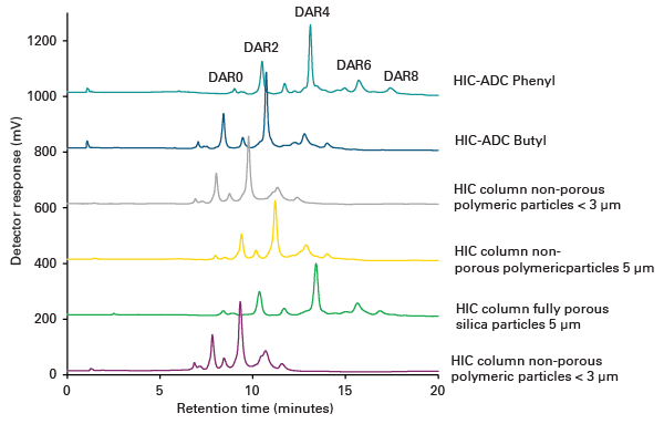 Bei der HIC ist es vor allem die homogene Partikelgrössenverteilung, die zu den Vorteilen führt: In der Regel innerhalb von sieben Minuten trennen die Säulen alle ADC-Varianten, und die Bestimmung der Verhältnisse von Wirkstoff und Antikörper (Drug-to-Antibody-Ratio; DAR) wird in dieser Zeit auch schon erledigt.