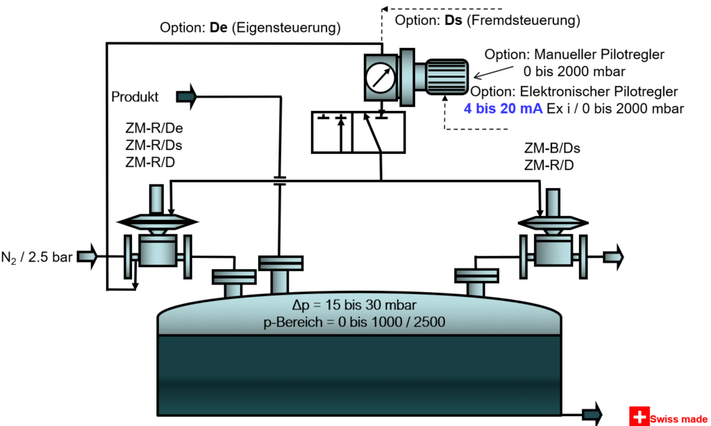 Die dynamische Druckregelung zwischen –1000 und +2500 mbar erfolgt entweder manuell über die entsprechende Federeinstellung oder über den Pilotregler und kann optional im EX-Bereich über die SPS gesteuert werden. Die hierfür vorgesehenen Zimmerli-Niederdruckregler sind in verschiedenen Materialien wie Edelstahl 1.4404, Hastelloy oder Kunststoff erhältlich und bieten dadurch hohe Langzeitstabilität und chemische Beständigkeit. Sie finden Anwendung in Bereichen wie Lagertanks, Reaktoren, Prozessbehältern, Zentrifugen und Nutschen.