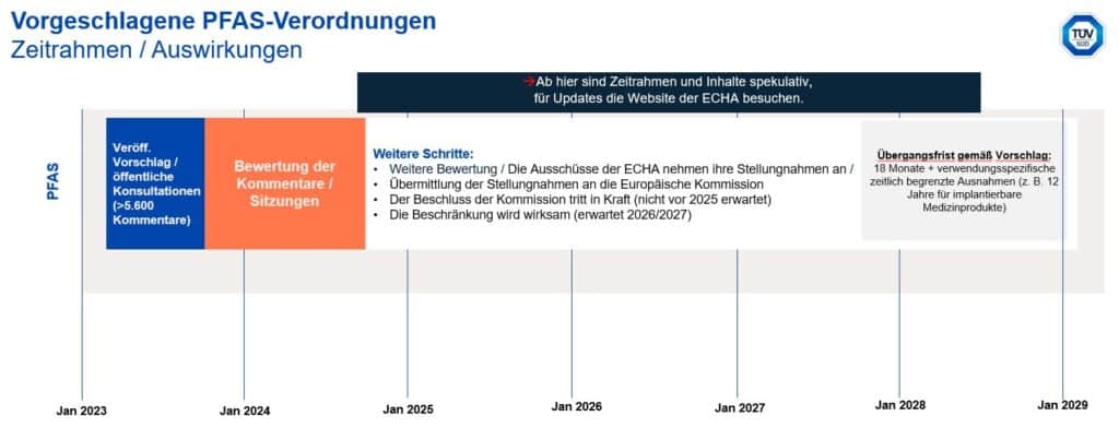 Aufgrund ihrer chemischen Eigenschaften kommen PFAS in vielen Medizinprodukten zum Einsatz. Ein sofortiges Verbot gilt hier als unwahrscheinlich, weil es die Gesundheitsversorgung stark einschränken würde. Ob und welche Übergangszeiten gelten werden oder ob gar Ausnahmen gewährt werden, ist derzeit nur schwer abzusehen. Deshalb sollten Hersteller so früh wie möglich mit der Forschung nach Ersatz beginnen.