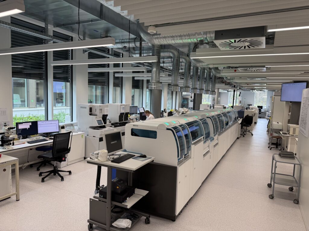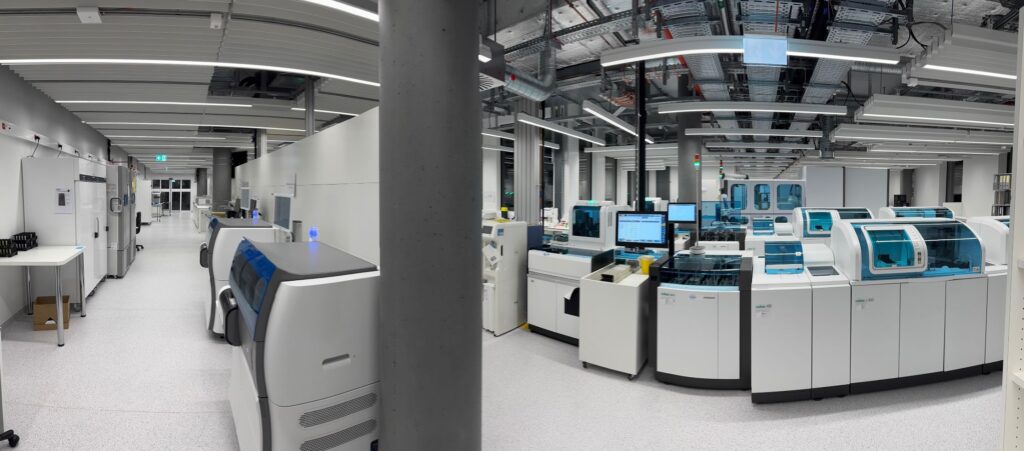Im komplett autonom funktionierenden Gebäude sind auch hochmoderne Analysegeräte installiert. Neben den neusten Bildgebungsverfahren beeindruckt vor allem die Laborstrasse von Roche Diagnostics. 2200 Proben pro Stunde werden auf der 33 Meter langen Geräte-Ökosystem automatisiert bearbeitet. Dabei werden die Proben via Rohrpostsystem in den Ablauf eingespeist, bevor sie dann in das gekühlten Lager gehen. Was früher Stunden in Anspruch genommen hatte, erfolgt heute in Minuten.