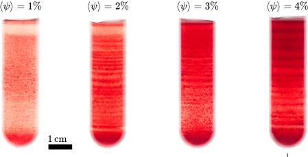Je höher, desto ausgeprägter die Streifen: Erst ab einer bestimmten Volumenkonzentration von roten Blutkörperchen führt das kollektive Verhalten zu einem makroskopischen Muster. Bei geringeren Konzentrationen treffen sich statistisch nicht genug Zellen während der Zentrifugation. (Bild: AG Wagner)