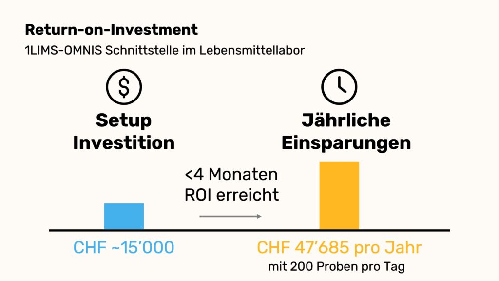 Für ein Lebensmittellabor, das täglich 200 Proben bearbeitet, ergeben sich beeindruckende Einsparpotenziale. Die Automatisierung spart jährlich zwei Tage in der Woche (867 Arbeitsstunden im Jahr), was bei den üblichen Kosten Ersparnisse von 47 685 Franken im Jahr entspricht. Bei Implementierungskosten von etwa 15 000 Franken amortisiert sich die Investition bereits nach weniger als 4 Monaten.