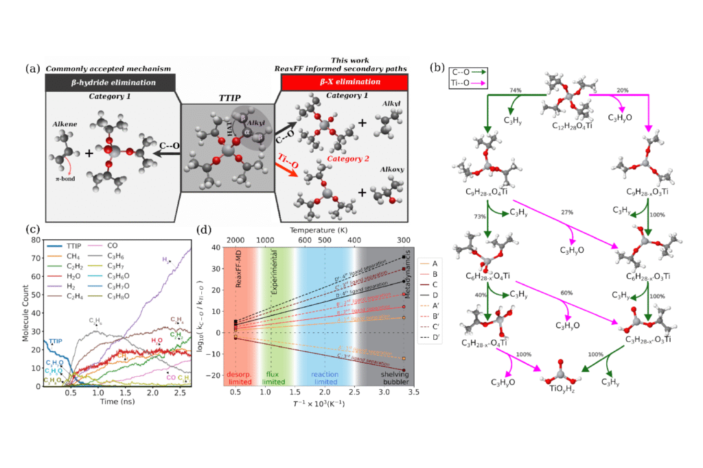 In ihrer Studie haben die Wissenschaftler rechenintensive Quantenmechanik mit der Effizienz von ReaxFF, einem Kraftfeld zur Simulation chemischer Reaktionen, und Metadynamik, einem Computersimulationsverfahren zum Abschätzen der Freien Energie und anderer Zustandsfunktionen von Systemen, verknüpft. Auf diese Weise gelang es ihnen, die vollständige «Reaktions-Landschaft» des Precursors TTIP zu kartieren. Als entscheidend erwies sich dabei die Entwicklung eines Multiphysik-Modell, das – anders als frühere Modelle – thermodynamische Triebkräfte und kinetische Einschränkungen (z.B. Aktivierungsbarrieren) überbrückt und damit zuverlässige Vorhersagen in komplexen Systemen jenseits der Grenzen reiner Gleichgewichtsmodelle.